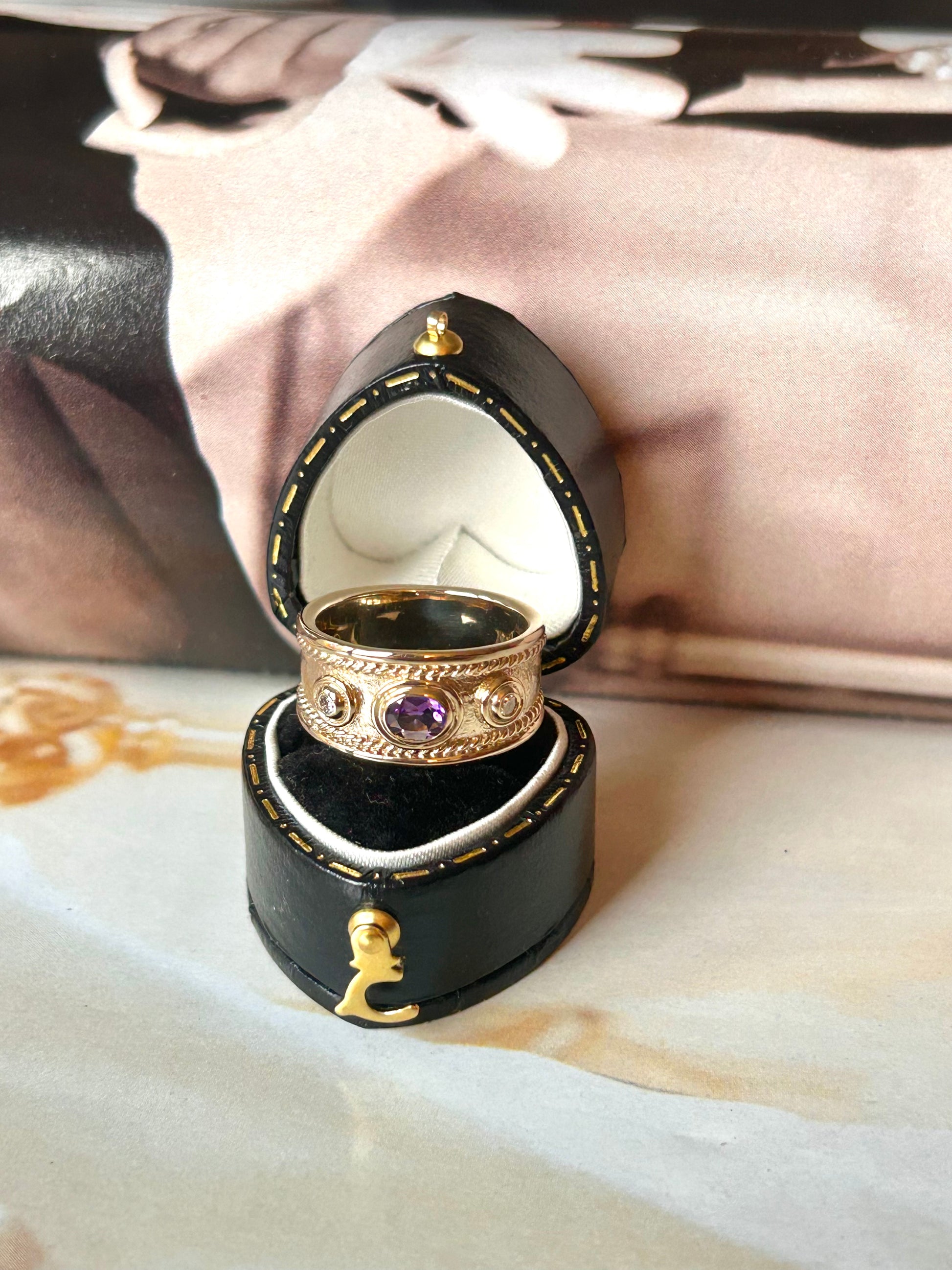 This beautifully detailed wide band features an oval amethyst set in a classic bezel setting, framed by two sparkling diamonds in matching bezel mounts. The textured gold finish and rope style detailing give it that rich, heirloom feel.