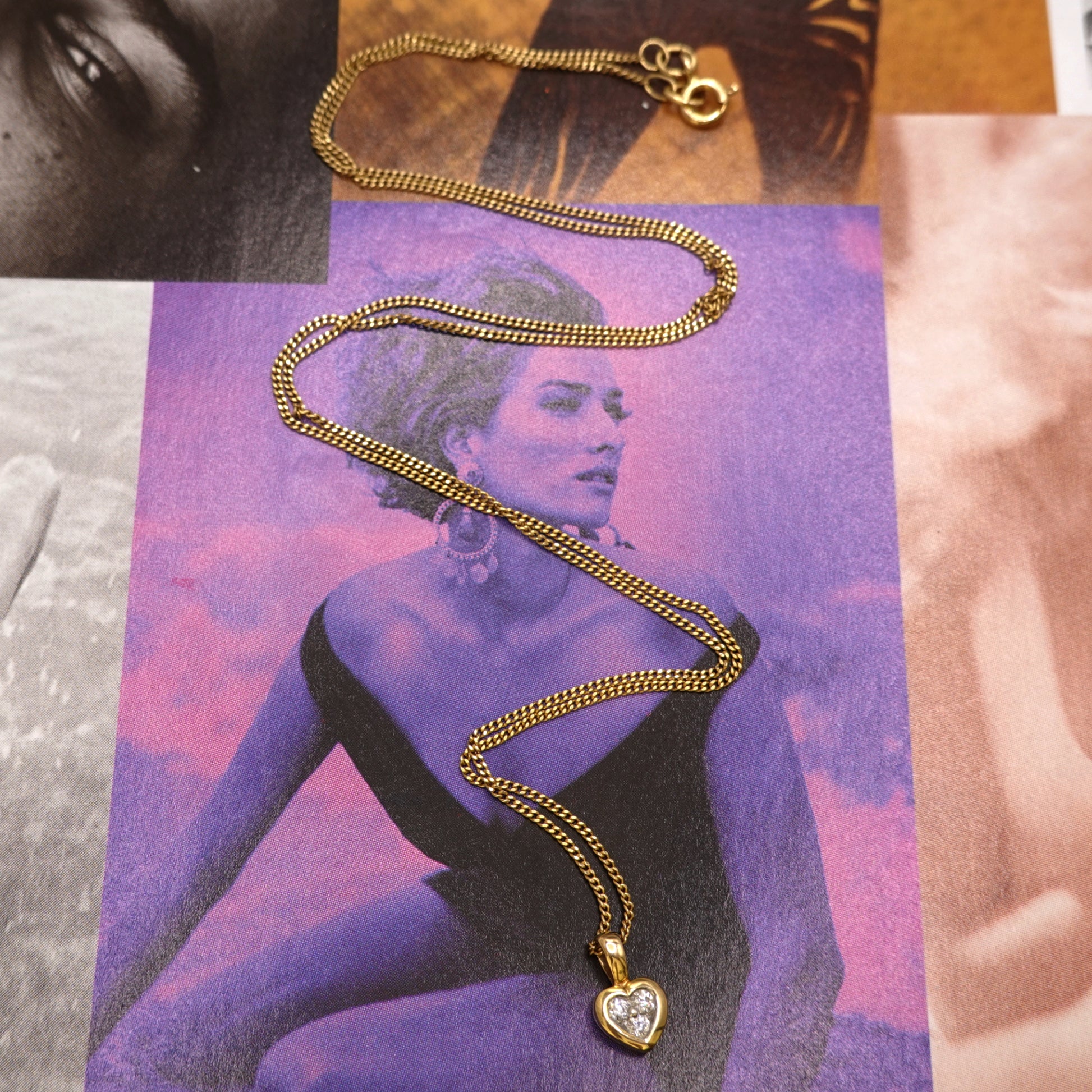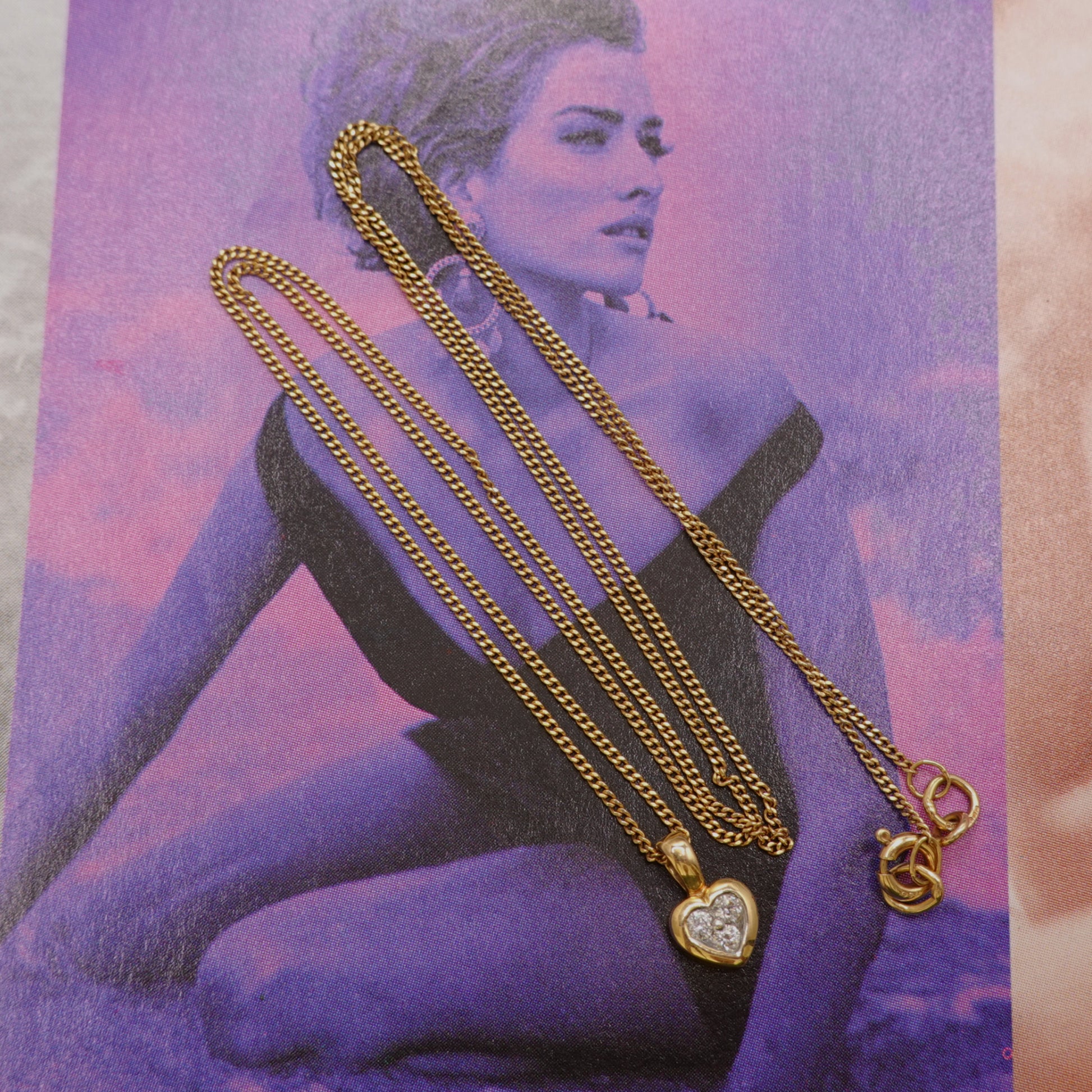 This exquisite miniature heart pendant is expertly crafted in 18ct gold and adorned with three brilliant-cut diamonds, adding a touch of sparkle. Paired with its original fine curb link chain, this necklace is an elegant yet subtle piece perfect for everyday wear.