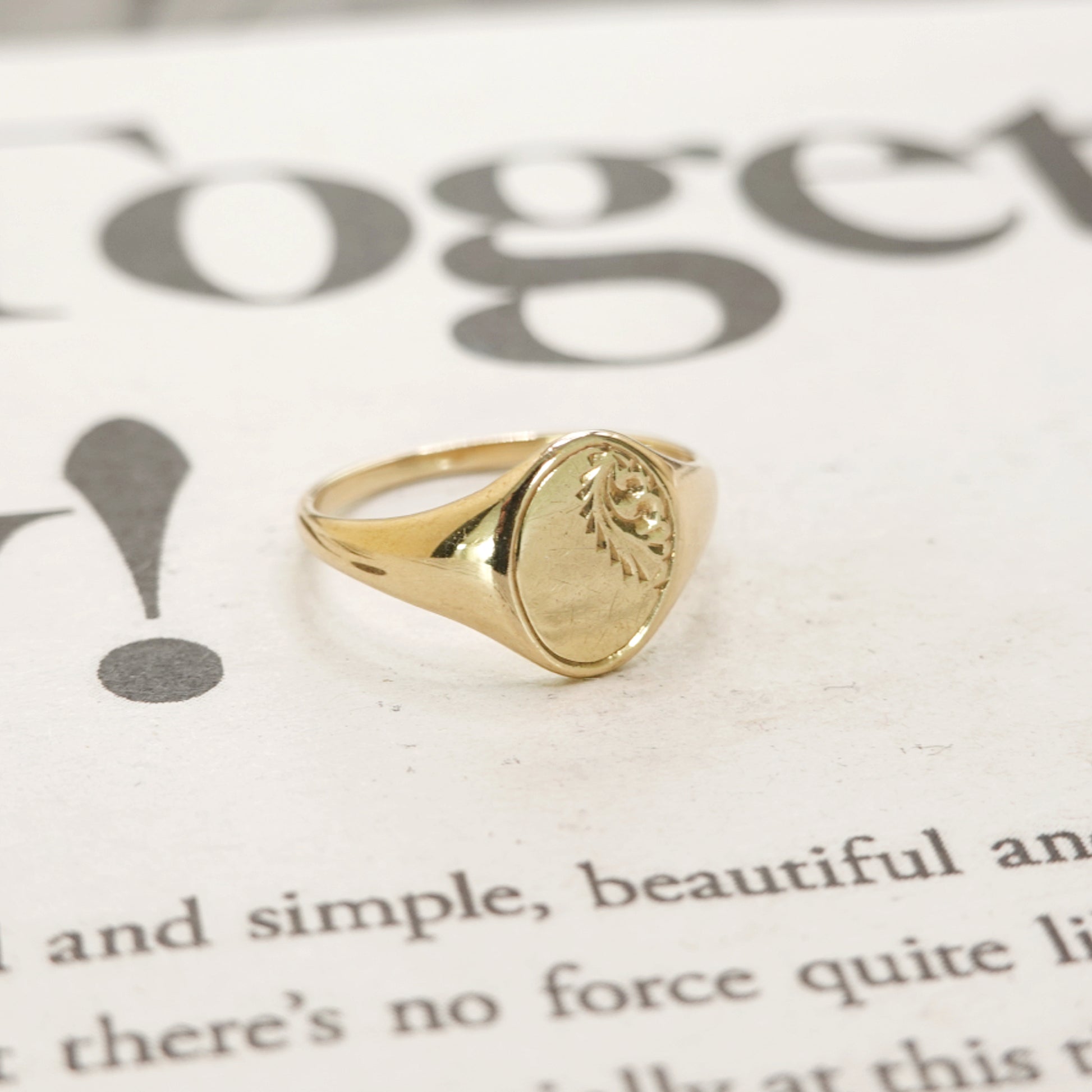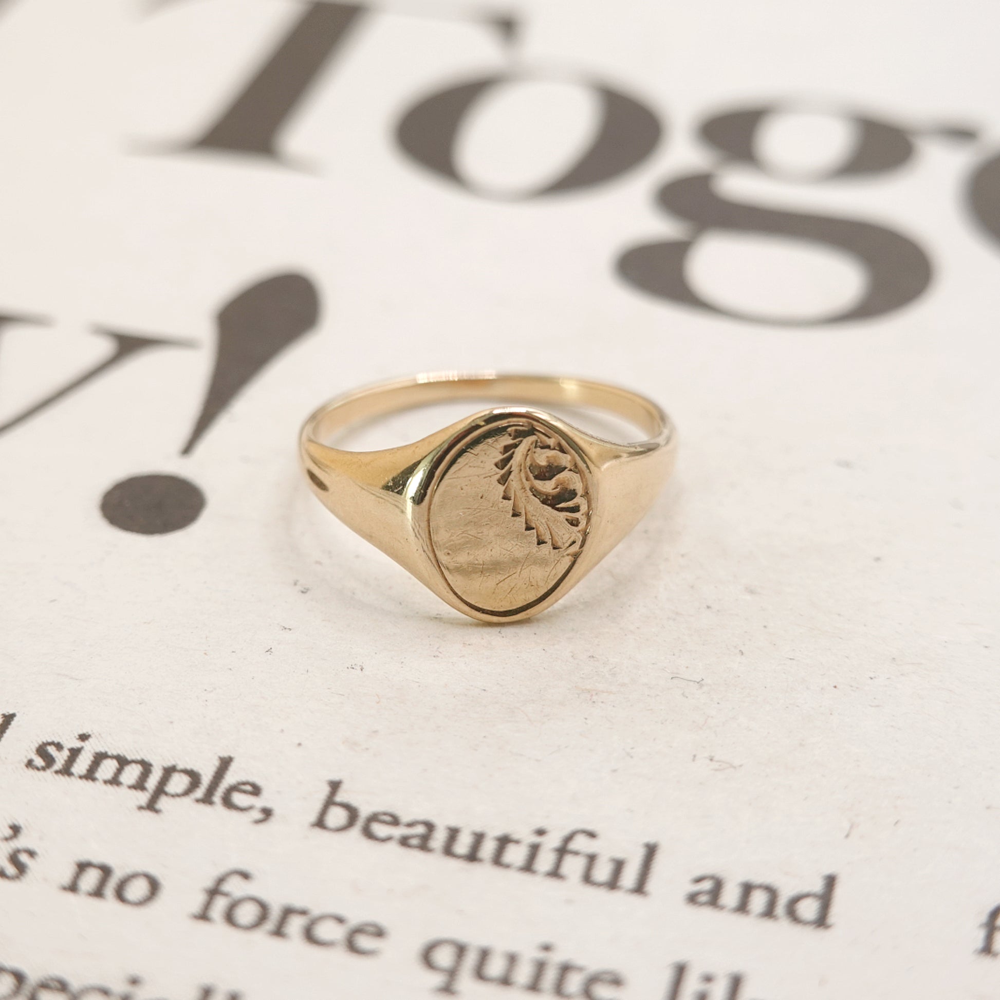 Description: A timeless 9ct gold signet ring which dates back to 1970's. This classic and minimal dainty gold ring is perfect for everyday wear and stacking. It features an oval face decorated with beautiful engraving. The ring is fully hallmarked for London 1977 and weighs 2.08gms.